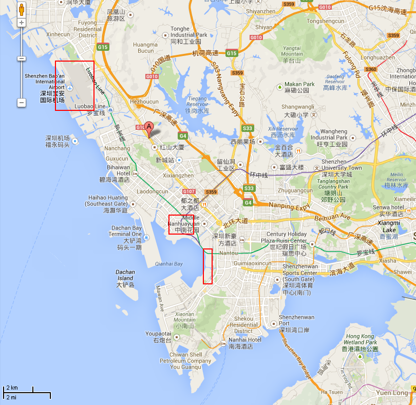 | "A" is NTE's site. Left box is Shenzhen's international airport. Middle box is Bao'an CBD. Right box is Qianhai district. (Source: NTE new releases, Google Map) |